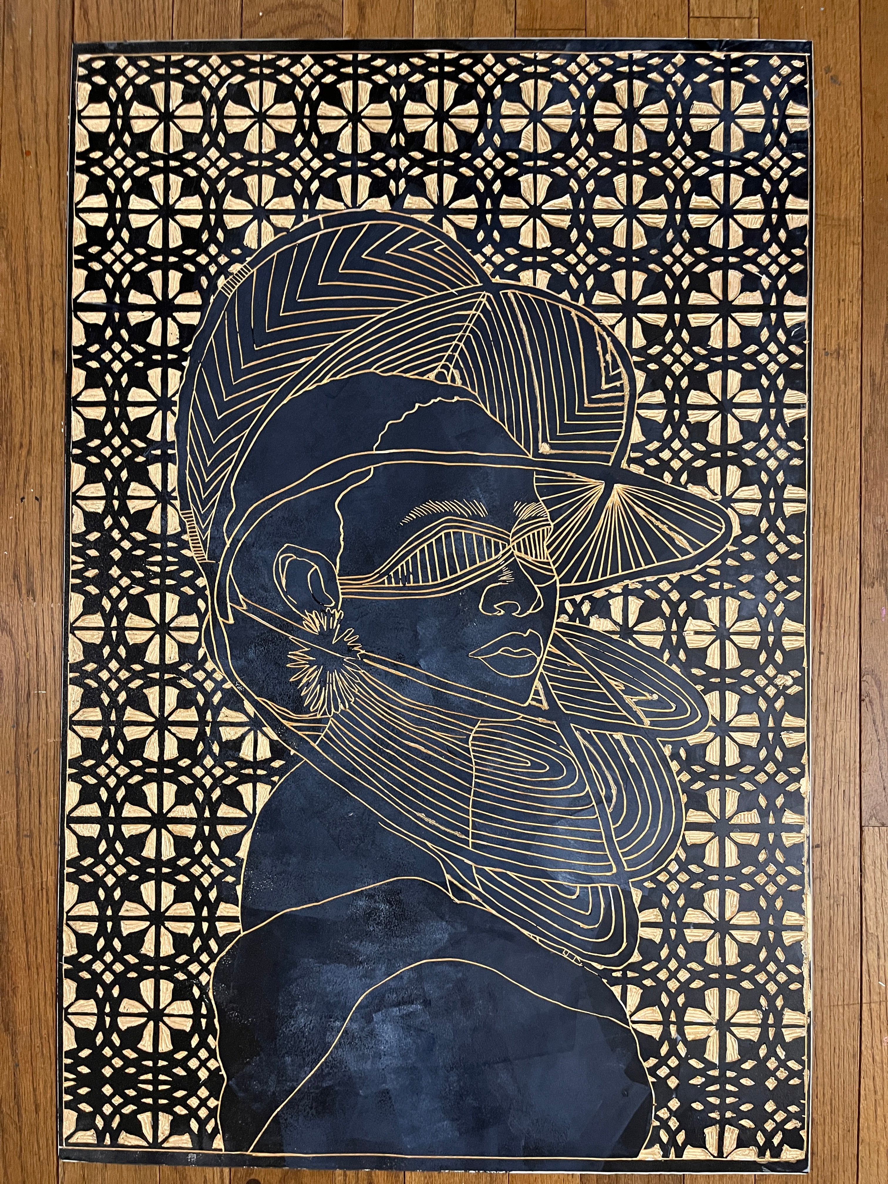 Includes Traditional abstract acrylic paintings on paper, canvas, wood, PVC, fabrics as well as any Yetunde's signature carved paintings.