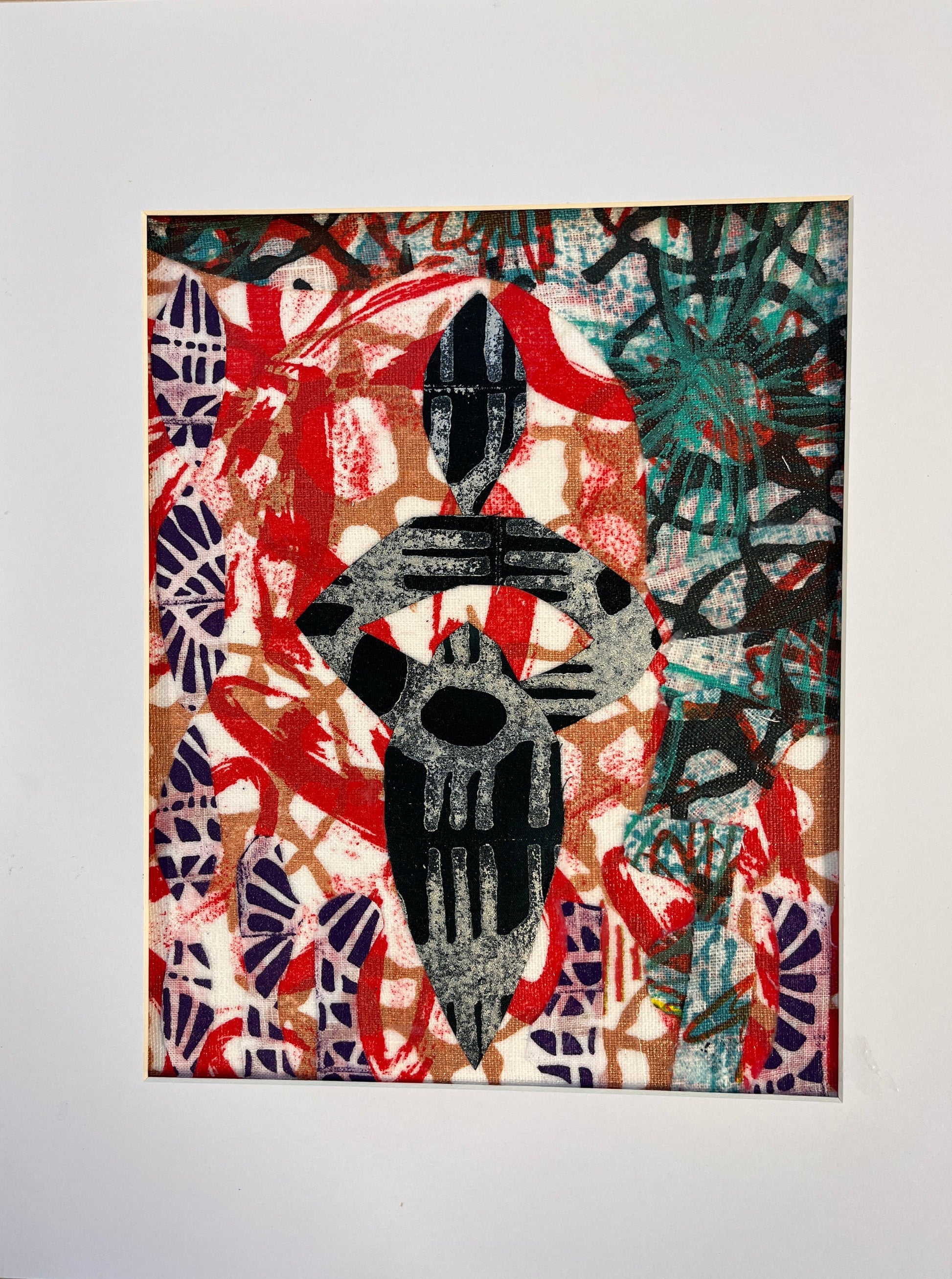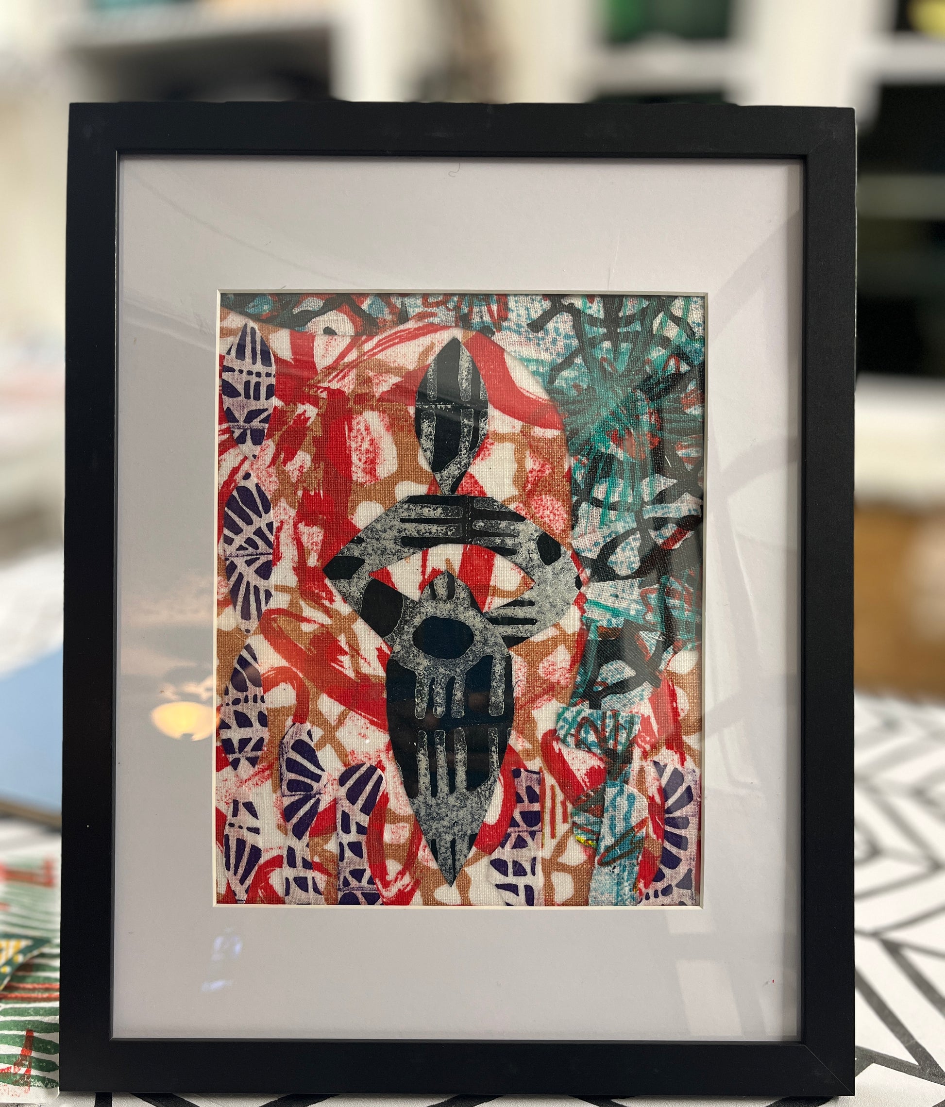 " A Home Inside" is an original fabric college pieced together by Yetunde. Yetunde's Fabric Collages are made with a collection of Yetunde's hand printed fabric. Each unique piece is comprised of test prints from different evolutions of Yetunde's art.
