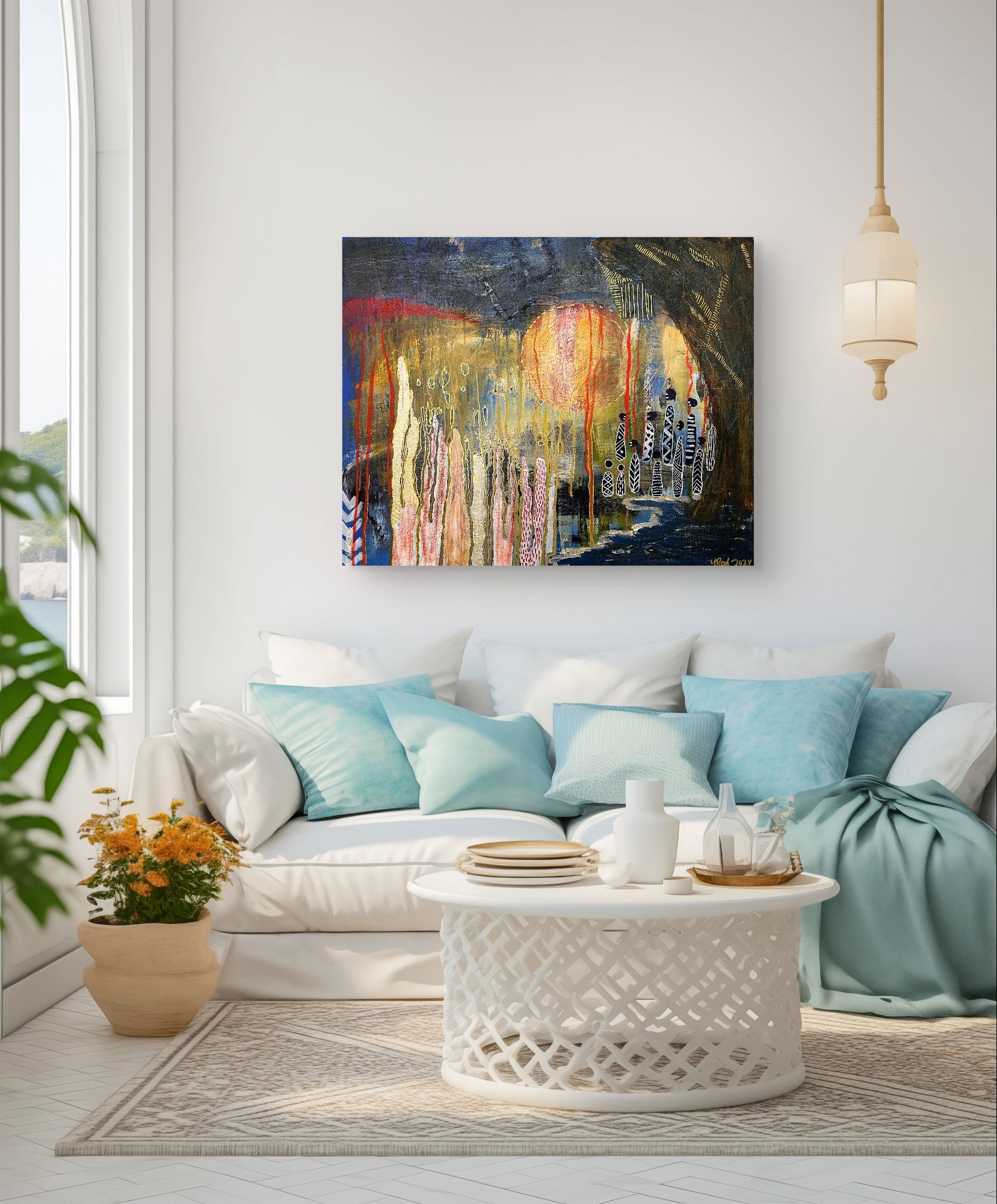 Prominent colors: blues, greens, reds, oranges, yellows, and golds.
