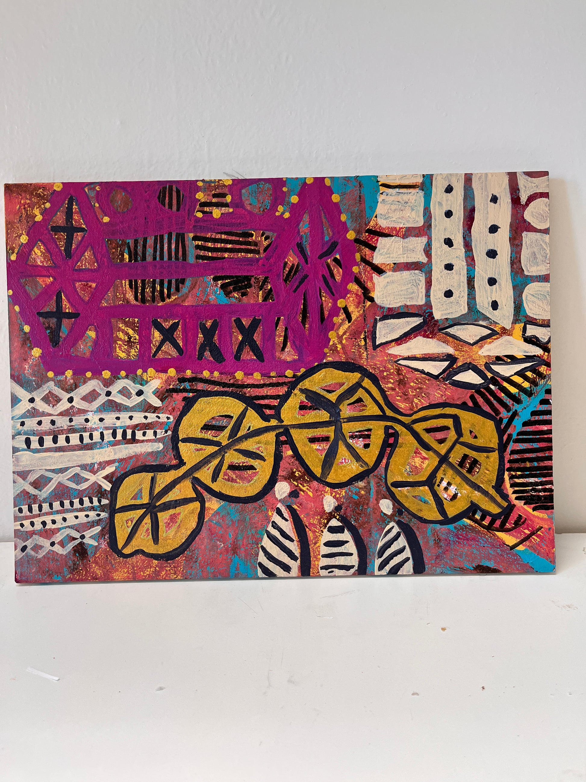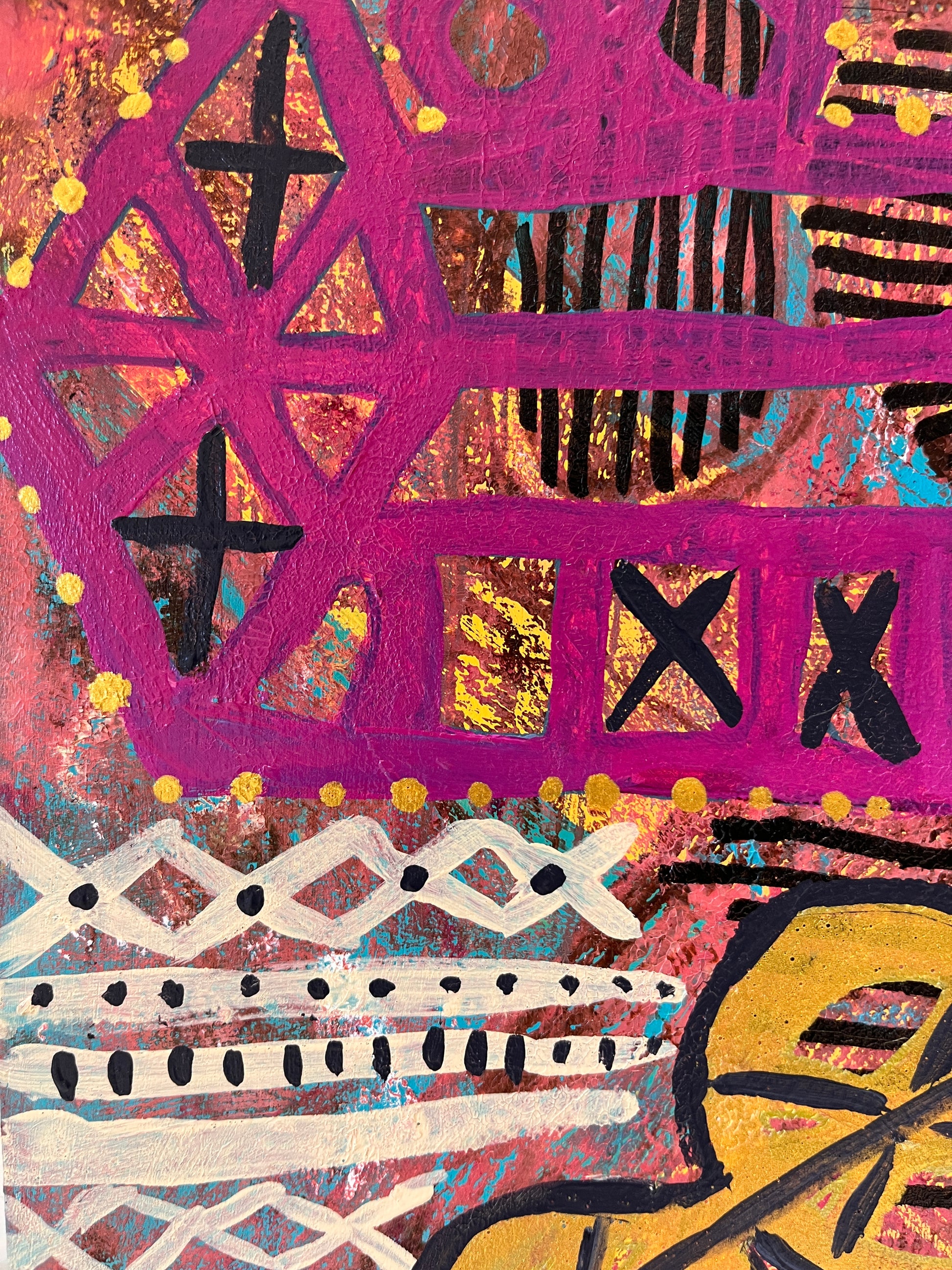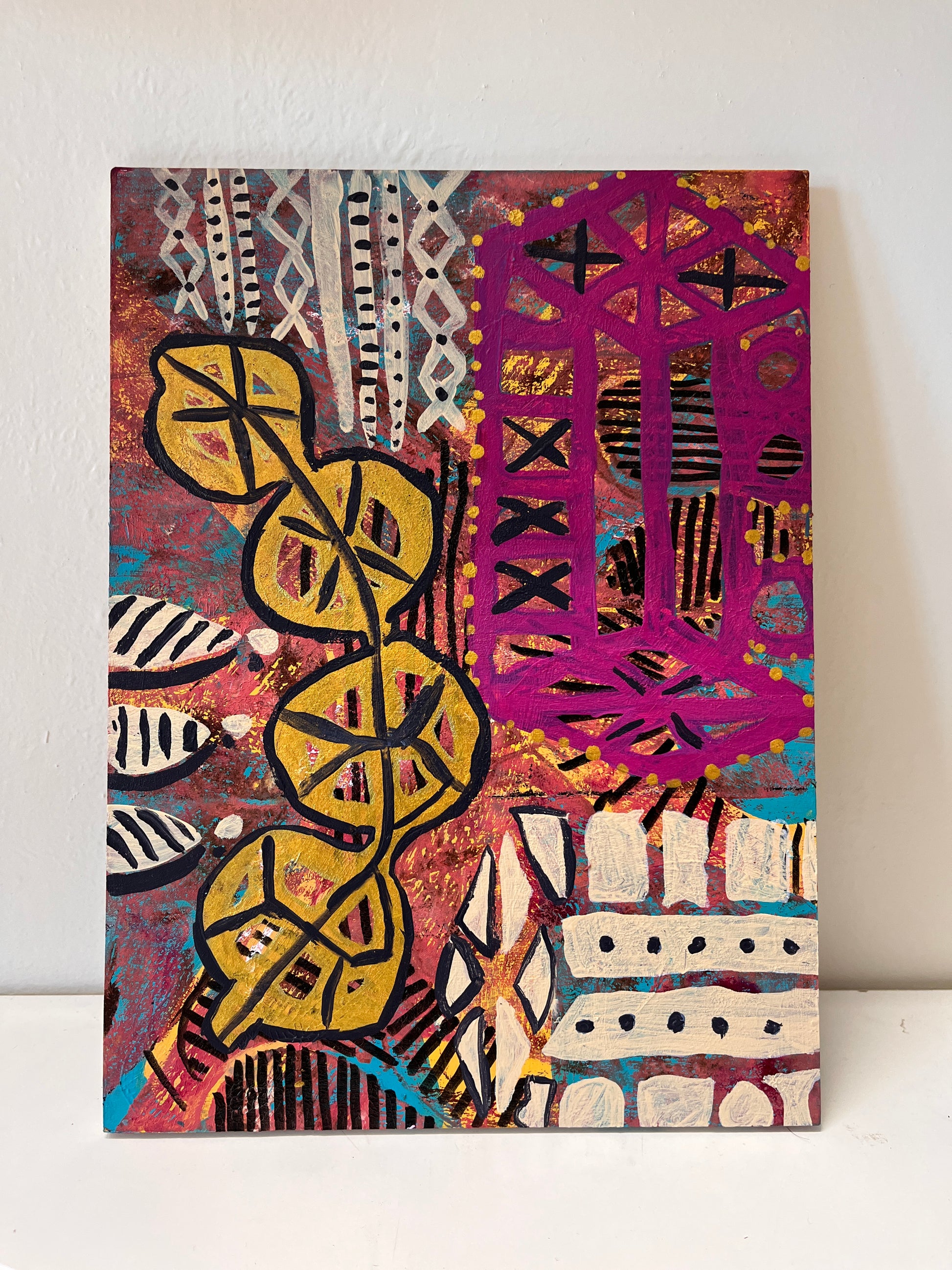 Golds, magentas, turquoises, off, white, and payne's gray colors.