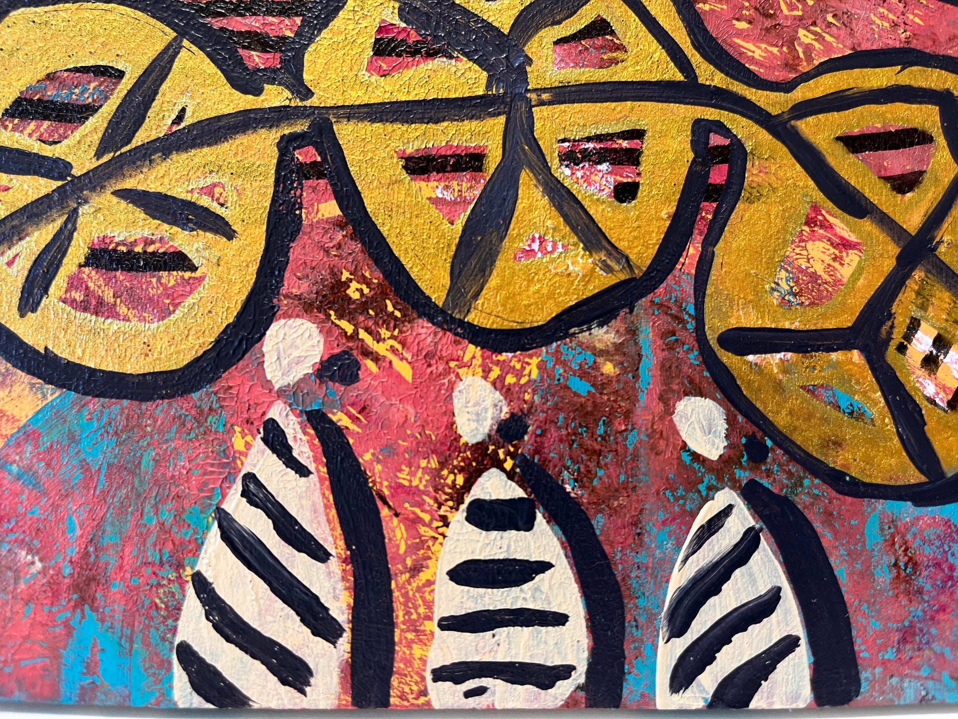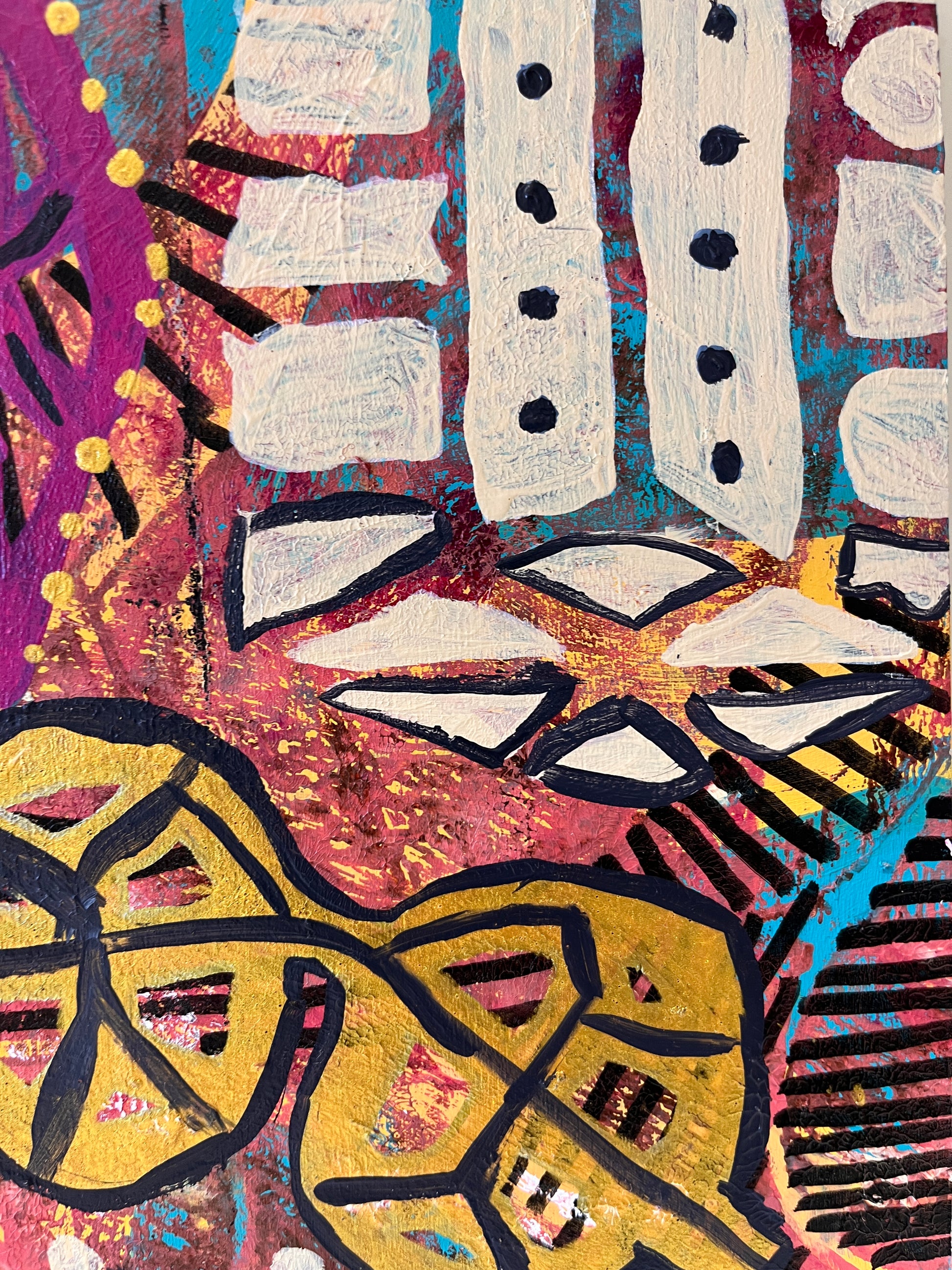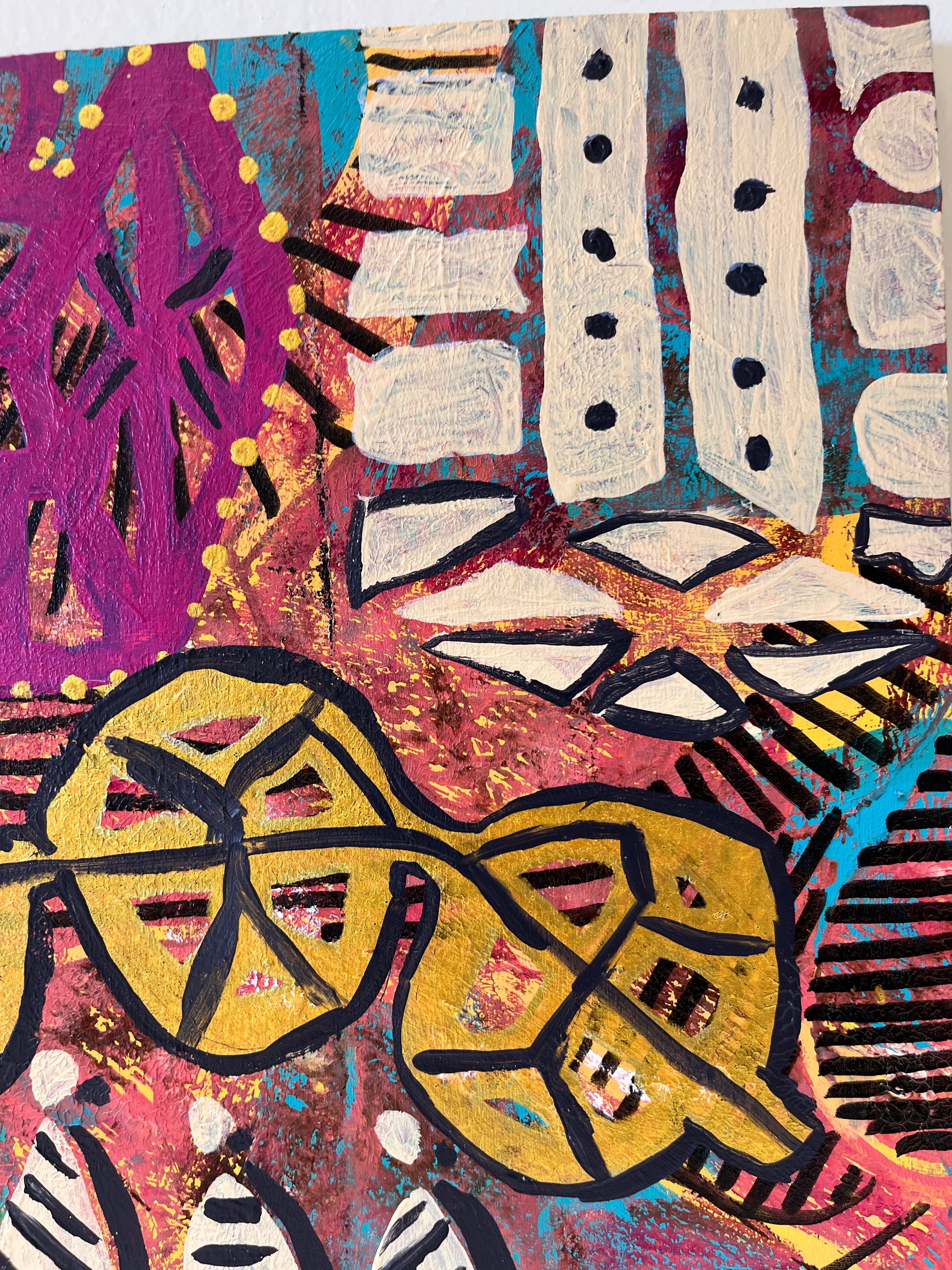 Golds, magentas, turquoises, off, white, and payne's gray colors.